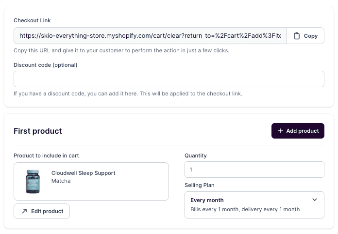 Send ads and emails straight to checkout with product, plan, and discount already applied.