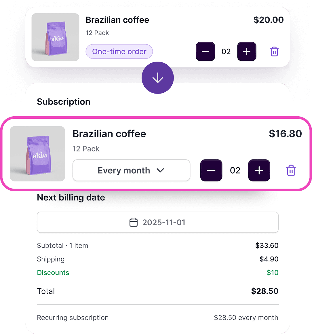 Reduce friction with bundles that provide value. Shoppers pick what they want. You set the rules (quantity limits, product groups, discounts). One subscription, multiple products, zero headaches.