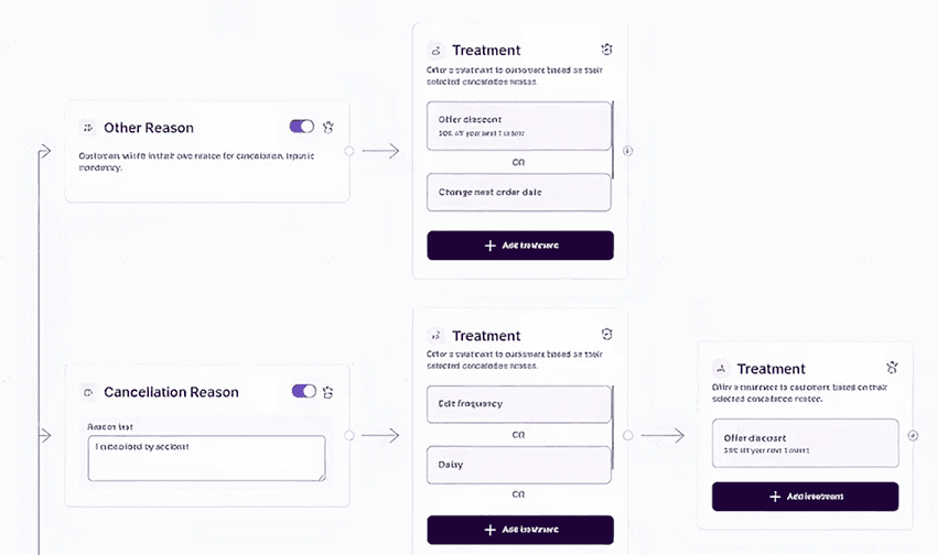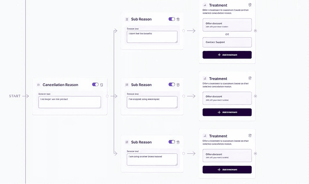 Collect cancel reasons, route customers through treatments like pause or product swap, then A/B test flows and measure save rate.
