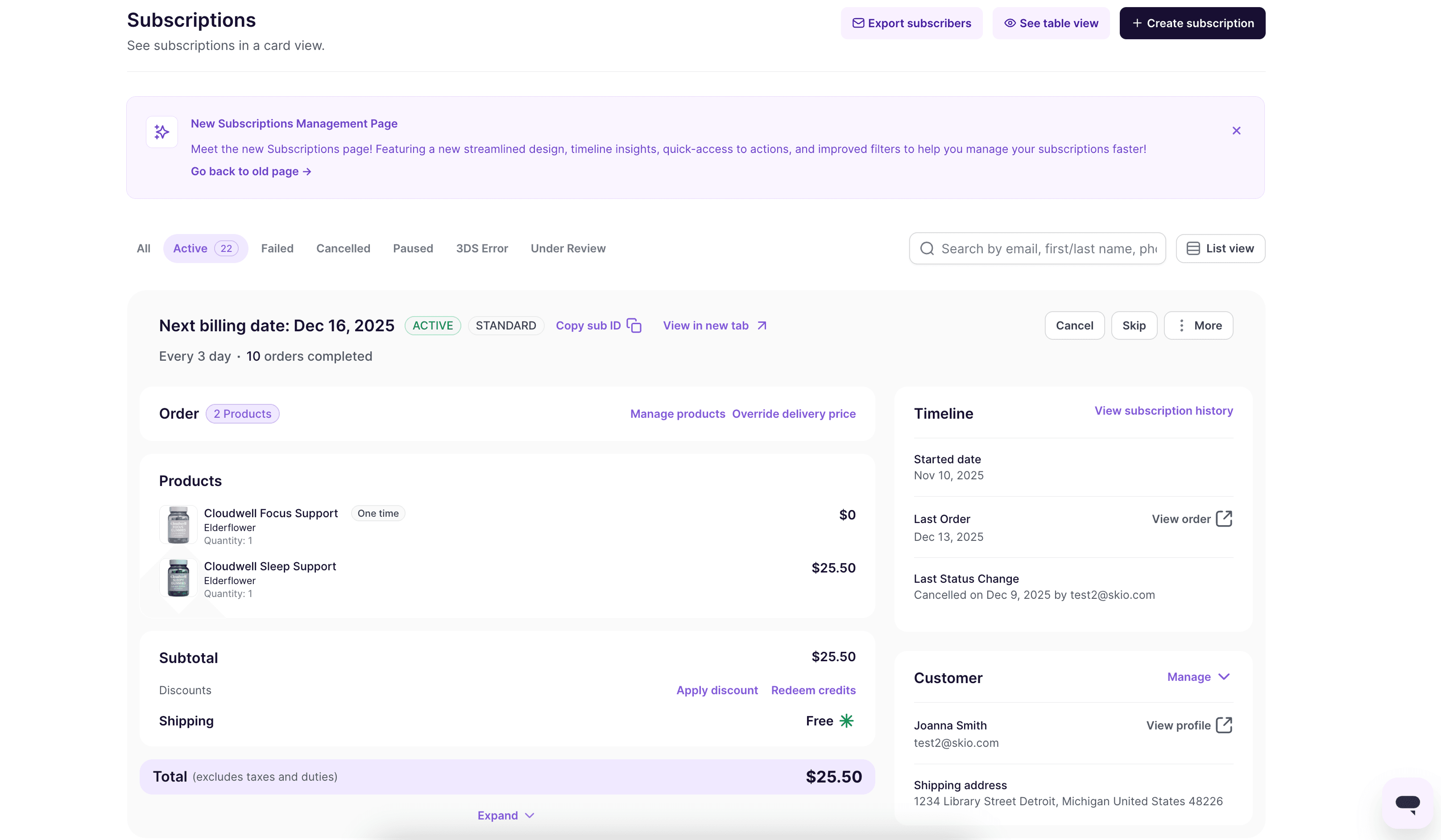 Skip, pause, swap, update billing, change addresses. All without emailing support. A more intuitive portal experience means customers can help themselves.
