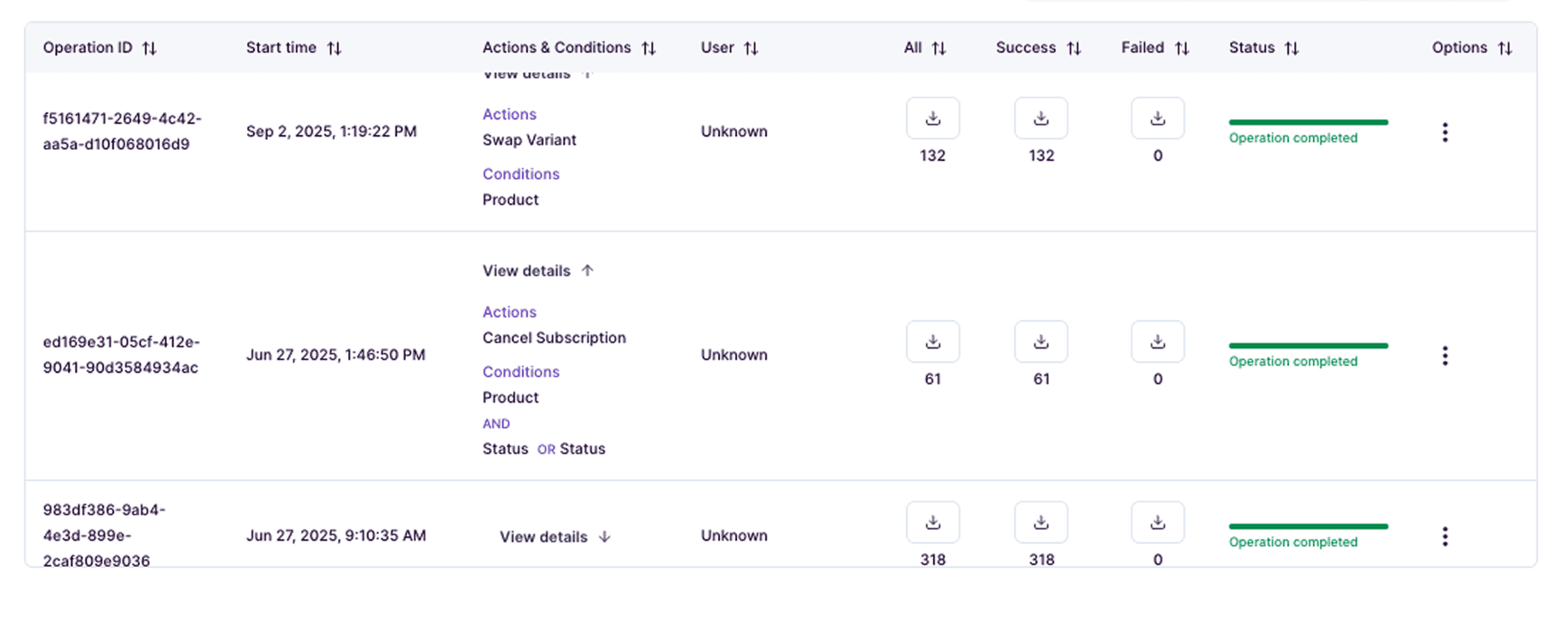 Target a segment, preview what will change, then execute. Download the outcome log and queue retries for failures.